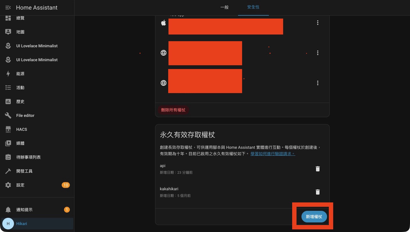 打開HA介面,點擊自己的帳號,進入 安全性Security),找到「永久有效存取權杖」,然後新增一個。